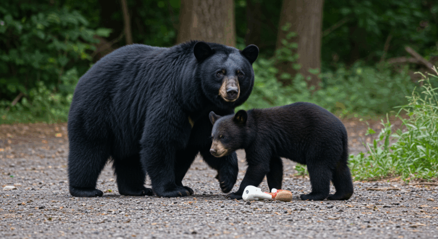 ImageFX(AI)で作成した餌を求めて市街地を徘徊するツキノワグマ親子のイメージ画像