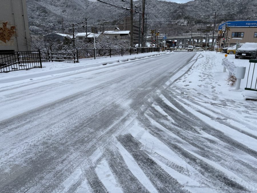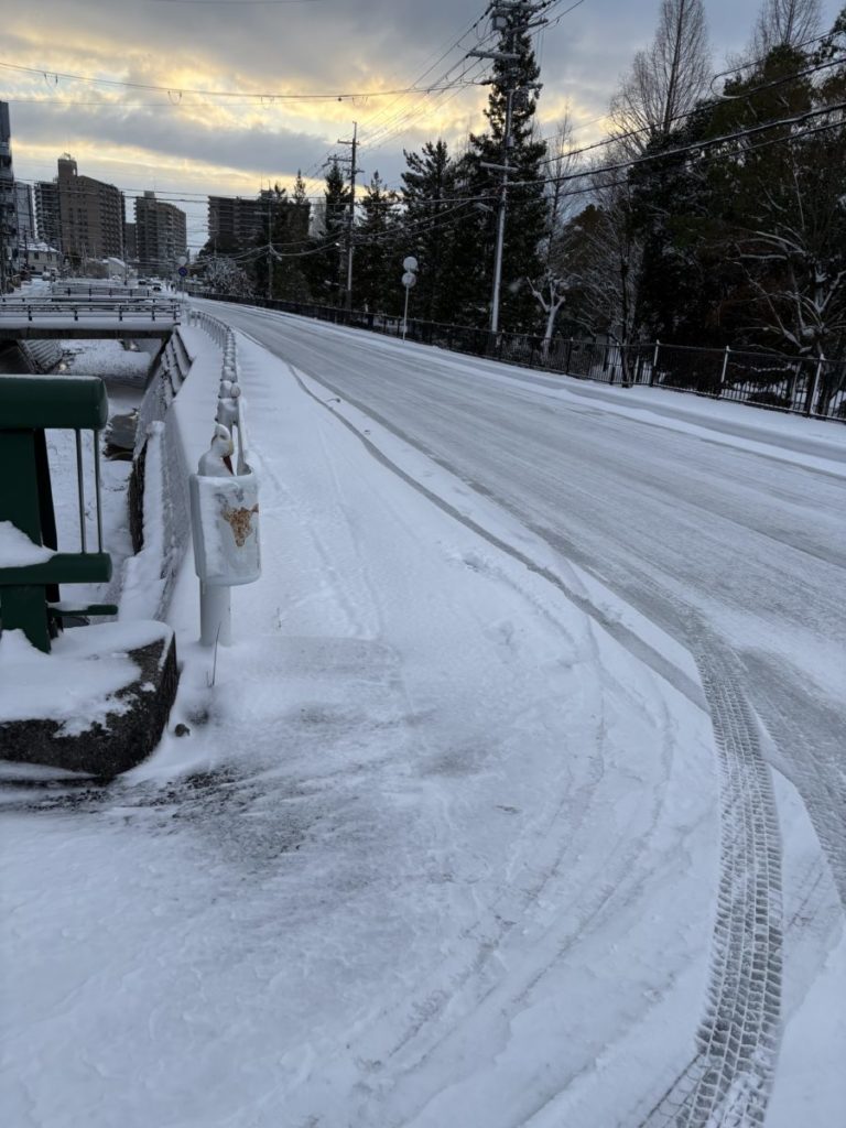 明けて9日の月曜日。朝起きると、窓の外はさらに白さを増していました。大津駅周辺でも数センチの積雪があり、路面はガチガチの凍結状態。